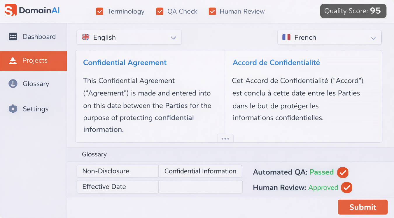 DomainAI helps organizations manage multilingual translation for legal, financial, and regulated content with greater consistency, control, and speed.
